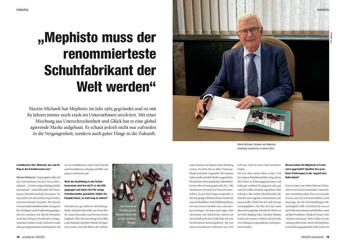 Erschienen im September 2025 im deutschen Magazin SCHUHKURIER, mit persönlichen Einblicken in das Berufsleben von Martin Michaeli und die Entwicklung der Marke MEPHISTO.